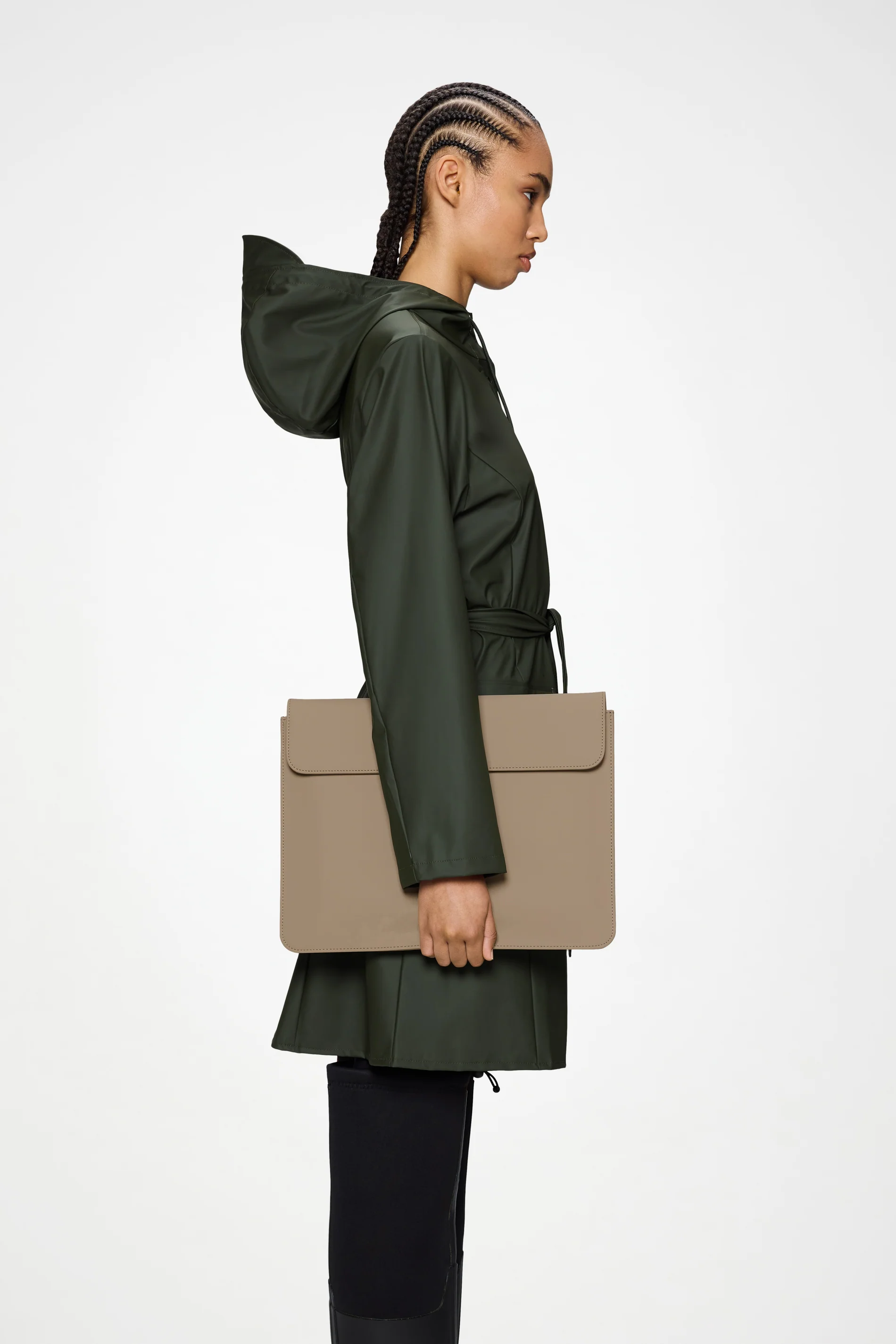Laptop Portfolio está confeccionada en el tejido de PU impermeable característico de Rains, creado para ofrecer robustez en el transporte, durabilidad y un suave acabado.