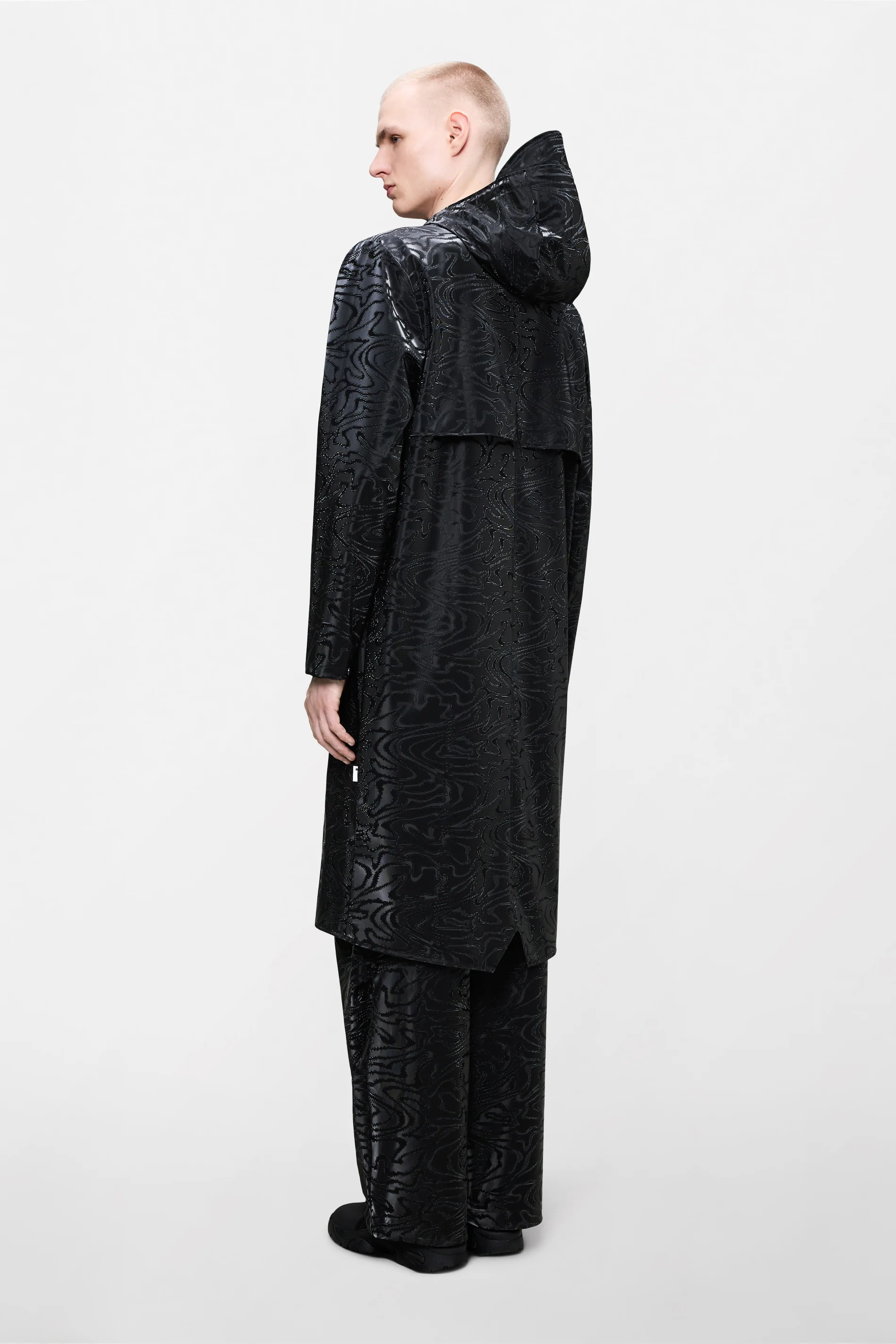 Longer Jacket está confeccionada en el tejido de PU característico de Rains con costuras selladas. Su acabado es ligero y de tacto suave.